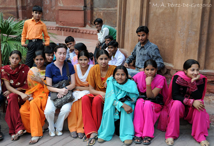 Anna con un grupo de estudiantes que visitaban, como nosotros, el fuerte de Agra