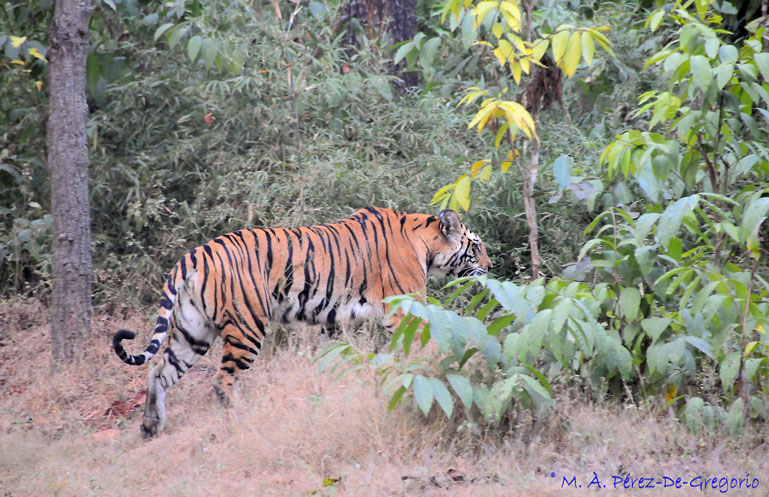 Un tigre (Panthera tigris), tras cruzar el camino delante de nuestros atónitos ojos, se adentra en la jungla del Parque Nacional de Bandhvagarh