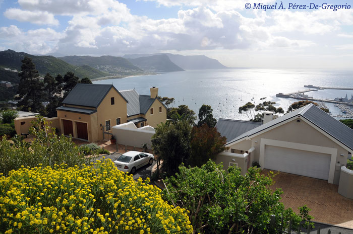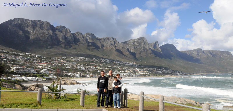 agosto, aterrizando en el aeropuerto de Cape Town sobre las 9 de la mañana. Allí nos esperaba Javier, al que habíamos conocido con su madre, en Barcelona, y Greg, que sería nuestro conductor. Nada más salir al exterior, comprobamos que allí era invierno, pero de verdad, ya que nosotros veníamos de un calor insoportable en Girona, y allí íbamos a estar la mar de fresquitos. Tomamos camino hacia Simon's Touwn, nuestro pimer destino. Por el camino pudimos ver las interminables dunas, con los lirios blancos en flor, las carreteras impecables, y los pueblos tranquilos. La mar, omnipresente. El Oceano Atlántico es una referencia continua, con sus montones de kelp, asomando por la superficie. Fue en ese trayecto, donde vimos nuestra primera ballena franca de Sur. Desde el coche ! Oriol y Miquel estaban muy contentos. Su primera ballena ! Llegamos a Simon's Town y nos alojamos en un B & B (bed & breakfast), encantador: el Albatros House, regentado por León y Sandy, que nos recibieron como si fuéramos parte de su familia. El alojamiento es una maravilla, con unas vistas sobre la bahía preciosas. Y qué desayunos ! Allí conocimos a Eduard y Rosa, de Berga, que estaban de luna de miel, y con los que cenamos en Simon's Town una noche.