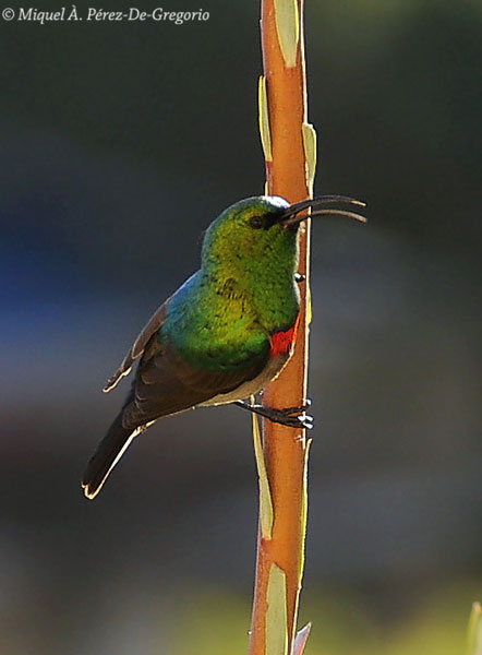 Desde el mismo balcón de la habitación, pudimos ver aves como este espectacular southern double-collared sundbird (Cinnyris chalybeus)