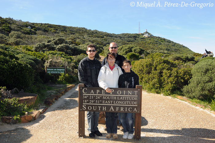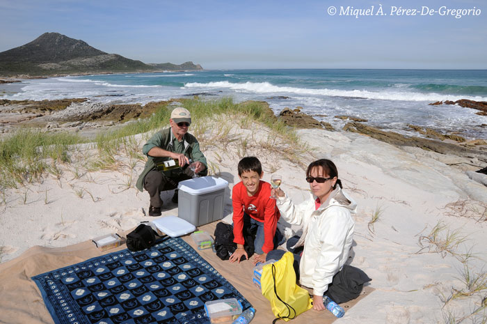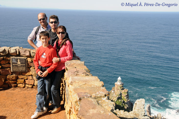 El día 14 de agosto, salimos de excursión para el Parque Nacional de la Península del Cabo, acompañados como siempre por Javier, pero en esta ocasión en el vehículo de León, propietario del Albatros B & B, y gran conocedor de la zona. El paisaje es sobrecogedor, con acantilados y flora únicos, y también bastante fauna. Visitamos el Cape Point, con sus faros viejo y nuevo, el Cabo de Buena Esperanza, y comimos un "pic-nic con mantel", en una playa solitaria de arenas blancas, brindando con vino blanco sudafricano. De vuelta, visitamos la colonia de pingüinos del Cabo de Boulders, justo al lado de Simon's Town.