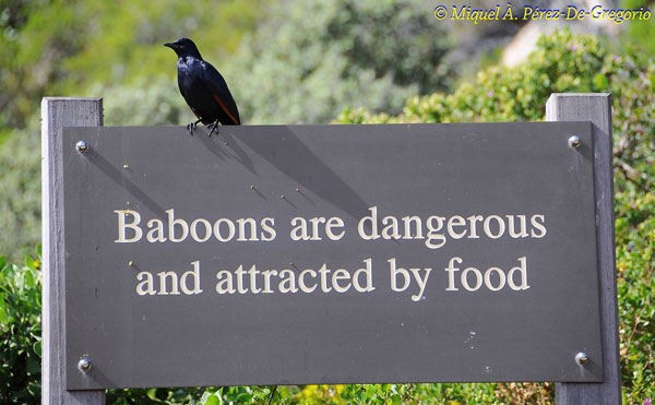 Un estornino de alas rojas (Onychognathus morio), se posa en un cartel indicador típico de la zona