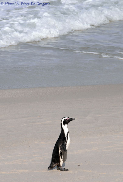 Uno de los pingüinos del Cabo (Spheniscus demersus), en la colonia de Boulders