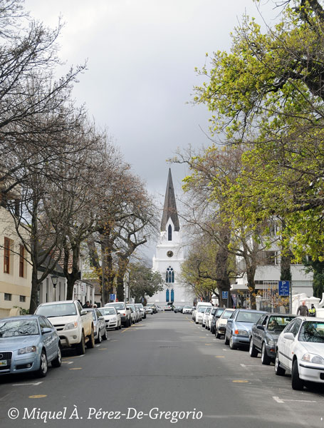 Detalle de una calle de Stellenbosch, con la iglesia al fondo