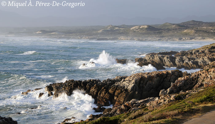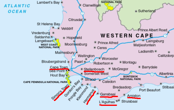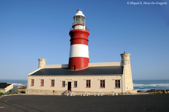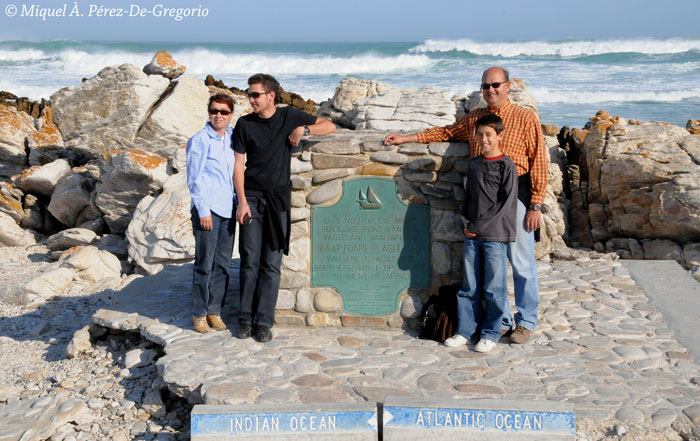 En la encrucijada de los dos oceanos: Atlántico e Índico, en el Cabo Agulhas, el punto más meridional de África. Tradicionalmente se decía que el Cabo de Buena Esperanza era el punto más al sur de África, pero en realidad está unos 150 Km más al norte