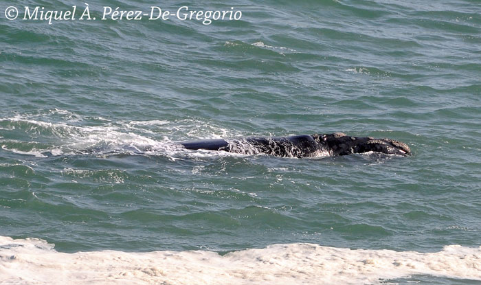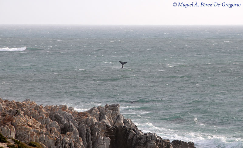 Ya de regreso en De Kelders, otra toma de una ballena franca del sur, muy cerca de la costa, y realizando su típico saludo con una de sus aletas.