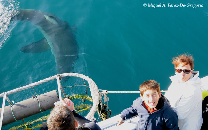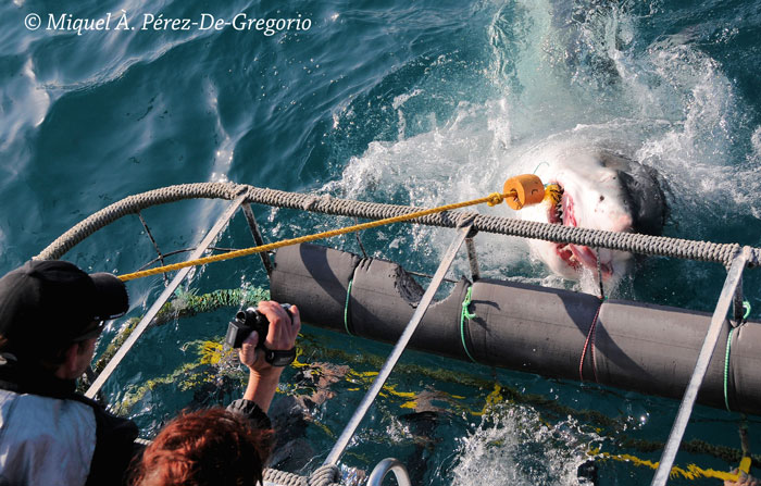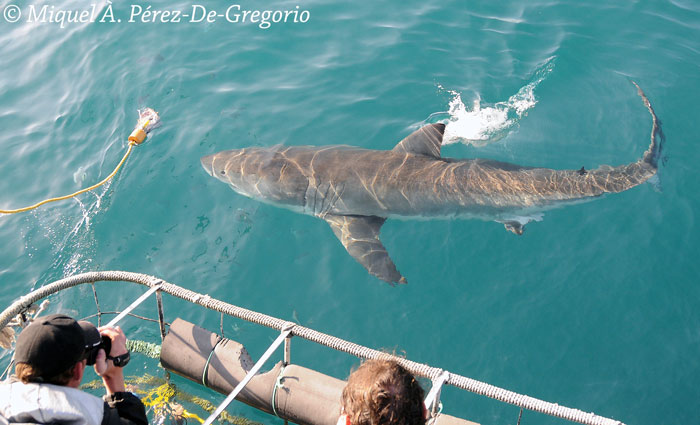 Mirad la belleza y tamaño del tiburón, junto a la jaula