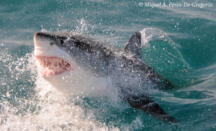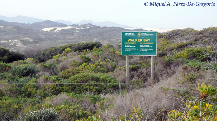 El 17 de agosto amaneció la mar seguía movidita. Ya nos habíamos quedado sin la salida en barco a ver las ballenas, pero no queríamos ni pensar en quedarnos sin salir a ver al tiburón blanco. Las ballenas se veían muy bien desde la costa de Walker Bay, pero los tiburones..... A eso de las 6 de la mañana, nos dice Jako que Renata la ha llamado que los barcos no salen.... Poco después, una nueva llamada. Corriendo a vestirse y deprisa al puerto de Gansbaai. Parece ser que la compañía de Michael Rutzen, conocido como Sharkman, sí se atreve a salir. Esta empresa, Shark Diving Unlimited, es una de las clásicas de Gansbaai. Describir lo que es ver a pocos metros de ti un tiburón blanco de 4,5 metros, es harto difícil. Tras desayunar en el propio local, salimos en el "Barracuda", rumbo a la Seal Island (Isla de las Focas) motivo por el que los tiburones están en esa zona. La mar está francamente agitada y el frío es considerable. Una vez rebasada la isla, la cosa se calma bastante. En poco tiempo, decido que es mejor fotografiarlo todo con la reflex desde un buen punto, que bajar a la jaula unos minutos con la compacta. Buena o no, esa fue mi decisión, y no me arrepiento, aunque espero ir en otra ocasión y bajar a la jaula, para verlo desde otro punto de vista. Después de la aventura, regresamos a De Kelders, donde nos esperaban las ballenas. Por la tarde, dimos un paseo con Kelly y con Javier por la reserva de Walker Bay, para ver su fauna, flora y sus cuevas. Por la noche, fuimos a cenar a casa de Renata. Una velada inolvidable.