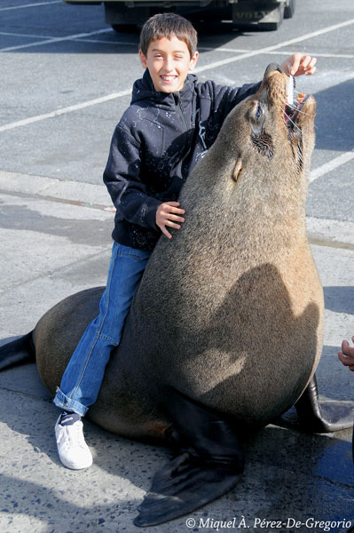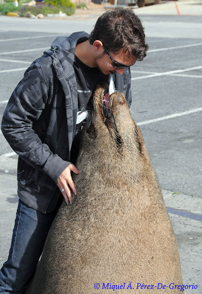Un inesperado encuentro en el puerto: dar de comer a un macho de león marino del Cabo (Arctocephalus pusillus).