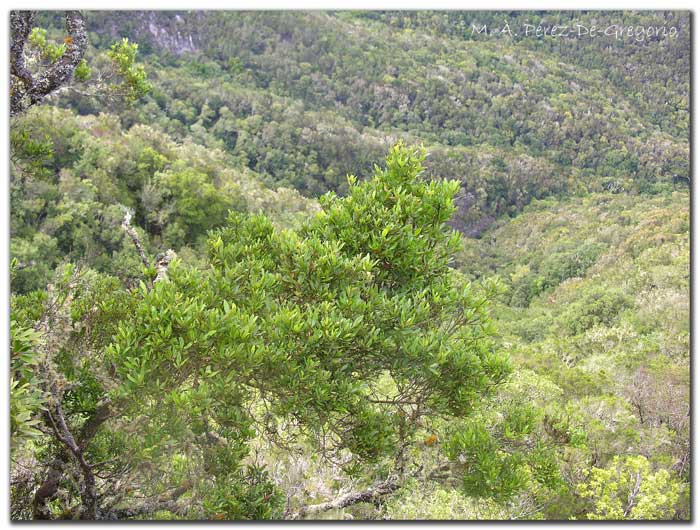 Detalle del bosque de larusilva: 500 - 1.000 m: se trata de un bosque denso de grandes árboles, herederos de la flora de la Era Terciaria, que crecen en zonas de abundantes nieblas y lluvias frecuentes. Las especies vegetales superiores que abundan son laureles, tilos, viñátigos, barbusanos, y otras de menor tamaño como el bicácaro, la cresta de gallo, la corregüela y una gran variedad de helechos. Con respecto a la fauna, la laurisilva es el estrato más rico en invertebrados y con mayor porcentaje de endemismos, entre los que se encuentran lombrices, moluscos y sobre todo artrópodos. Dentro de la fauna vertebrada hay que mencionar algunas especies de murciélagos y dos aves endémicas en peligro de extinción como son las palomas turqué y rabiche.