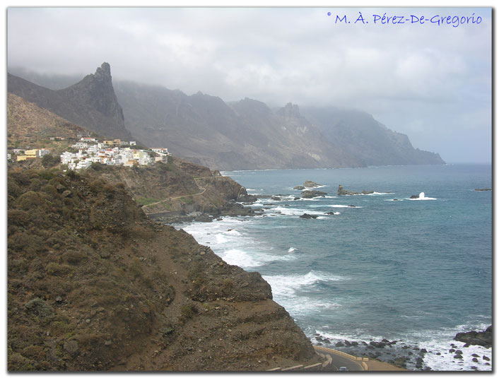 Tras la excursión en barco, nos dirigimos a visitar el pueblecito de Masca, pasando por el municipio de Santiago del Teide. Las personas con vértigo o problemas con las curvas, mejor que se abstengan.... menuda carreterita ! Masca es un caserío ubicado en la punta noroeste de la isla y que pertenece al municipio de Buenavista del Norte, con unos 120 habitantes, que parece haberse detenido en el tiempo. En Masca se pueden encontrar profundos barrancos y acantilados que terminan en el Océano Atlántico entre la vegetación y las curvadas carreteras. Tiene la reputación de haber sido un escondite de los piratas. Masca destaca también por su arquitectura tradicional, pese a que la mayoría de sus construcciones no tengan una gran antigüedad.