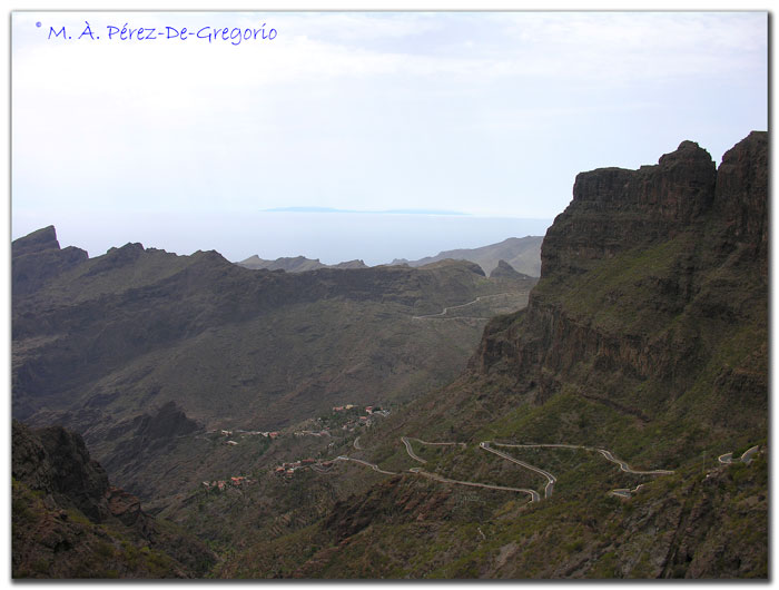 Una panorámica de la sibuosa carretera que lleva a Masca. Al fondo se ve la silueta de la isla de La Palma. Desde lo alto, a la izquierda de la foto, también se observaba la isla de la Gomera
