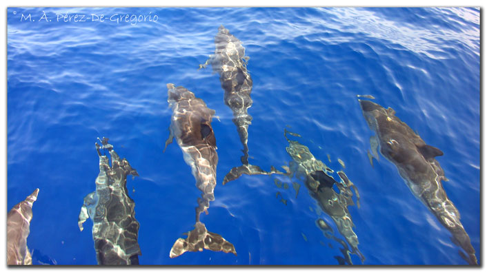 Grupo de delfines mulares (Turpsiops truncatus) y moteados (Estenella frontalis)