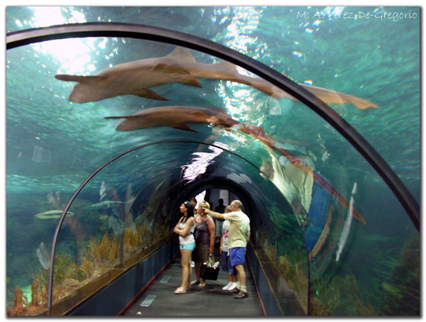 Detalle del acuario, con los tiburones