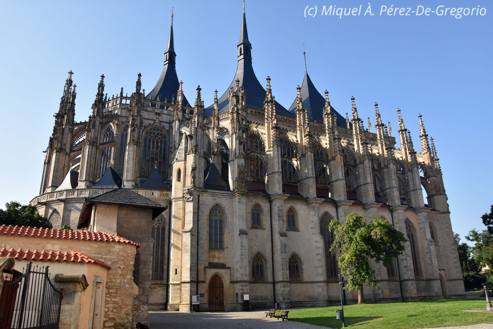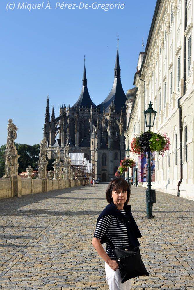 Viernes 23 de agosto, tras desayunar (muy bien) en el hotel, a las 9 en punto estamos en la puerta de la catedral de Sta. Bárbara, una de las iglesias góticas más importantes de centro europa, y de gran belleza. Fue declarada monumento patrimonio de la Humanidad en 1995. Kutná Hora tuvo su mayor desarrollo en el s. XIII, gracias a las cercanas minas de plata, llegando a rivalizar con la ciudad de Praga. Más tarde, la Guerra de los 30 años y varias epidemias de peste, acabaron con su esplendor. Además de la catedral, destaca su centro histórico, en el que sobresale la torre de 85 metros de altura de la iglesia de San Jacobo, del s. XVAlgo alejada del centro, en el barrio de Sedlec, se halla la capilla de Todos los Santos. Por ello, tras la visita de la catedral, hicimos el check out del hotel, cargamos el coche, y nos dirigimos hacia esta capilla, conocida por su peculiar osario. Este osario contiene aproximadamente 40.000 esqueletos humanos, colocados artísticamente para formar la decoración y el mobiliario de la capilla. El lugar tiene algo de morboso, pero eso sí, es algo único en el mundo y su visita merece la pena.