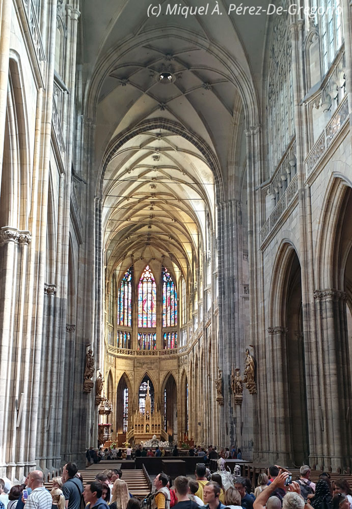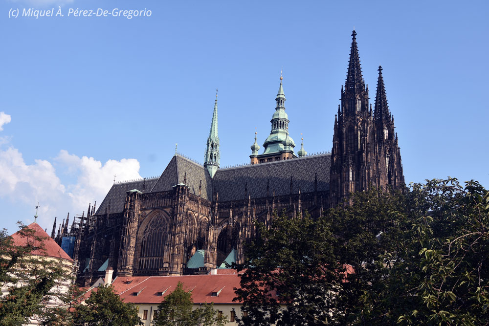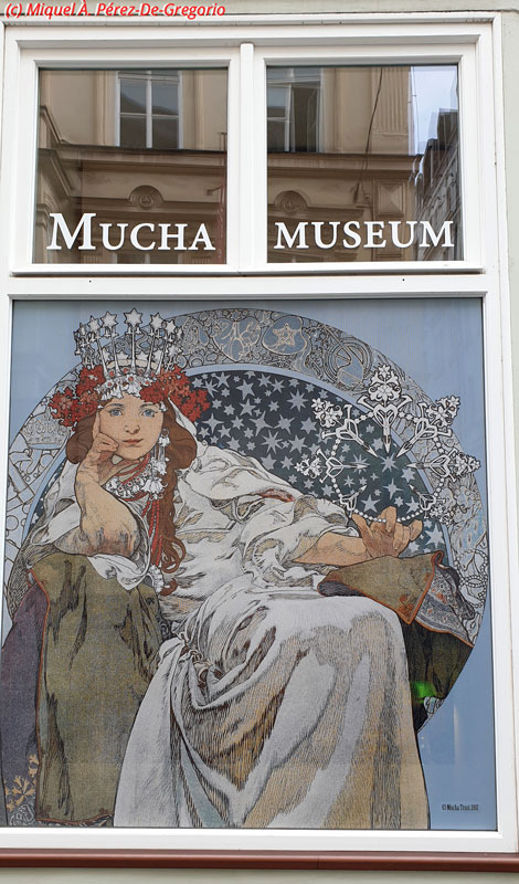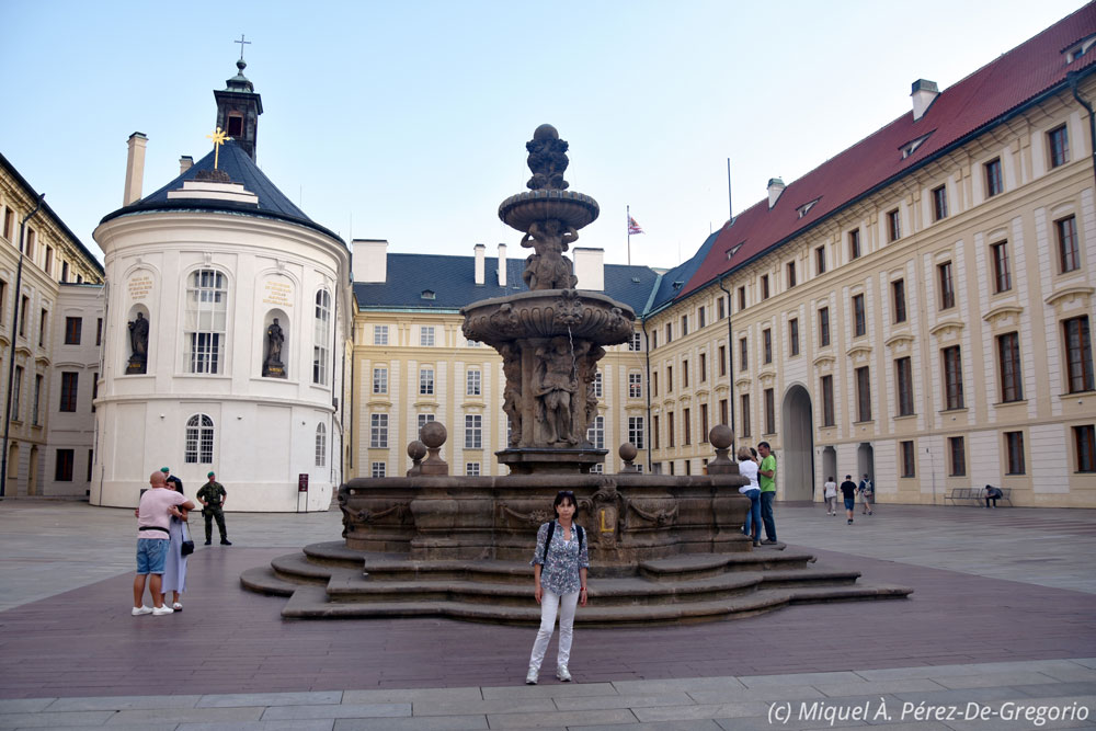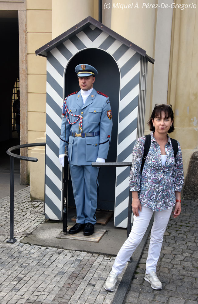 Martes 27 de agosto. Nuestro primer día entero en Praga iba a estar condicionado a la visita al llamado "Castillo". Hemos contratado una visita guiada y nos recogen en la calle Na Prikope a las 11.15 h. La visita durará tres horas y media, así que desayunamos en el Hotel Clement, (muy bien, por cierto), y decidimos aprovechar el tiempo. Así que, sin más dilaciones, llamamos a un UBER y le decimos que nos lleve al Museo Mucha. Es este el único museo en el mundo dedicado a la vida y la obra del representante del modernismo mundialmente conocido, Alfons Mucha (1860-1939). La entrada no es barata (unos 12 €), pero realmente vale la pena. Nos gustó mucho. Es un museo pequeño y se ve bien en media hora. Las fotos están prohibidas, incluso sin flash.Imagen de la fachada del museo Mucha Salimos y, a pocos metros, ya estamos en Na Prikope, donde nos sumamos a un pequeño grupo compuesto por 4 españoles más y 6 norteamericanos, con la que sería nuestra guía, Sara, que irá haciendo las explicaciones en inglés y castellano, respectivamente. No somos entusiastas de las visitas guiadas, pero tiene sus ventajas, como por ejemplo, a la hora de "colarse" en algunas visitas... Como repiten una y otra vez, el llamado "Castillo de Praga" no es realmente un castillo, sino un conjunto de palacios, monumentos, iglesias, patios, jardines, etc., que ayudan a comprender la importancia y el esplendor históricos de Praga y de Chequia en general. En ese sentido, se considera el complejo como el más grande del mundo, y en la actualidad, sigue albergando la residencia del Presidente de la República. Se empezó a construir en el s. IX, y en su interior alberga la catedral de San Vito, el convento de San Jorge que contiene arte antiguo de Bohemia, la basílica de San Jorge, el Palacio Real, galerías de pintura renacentista y barroca en las antiguas caballerizas del castillo, entre otras muchas cosas. Lo primero que nos vamos a encontrar, va a ser el cambio de guardia. Tras el "espectáculo", entramos en el llamado segundo patio en donde se halla la Fuente de Kohl. Nos informan de que la parte en donde vive el Presidente de Chequia está cerrada por visita oficial, por lo que pasamos a ver una de las joyas del complejo: la catedral de San Vito. Esta catedral católica es el monumento gótico más importante de Praga. Se empezó su construcción en el s. XIV, pero no se acabó hasta princopios del s. XX. Destacan por su belleza sus varias fachadas, especialmente el mosaico del Juicio Final, obra del artista veneciano Niccoletto Semitecolo. También son destacables sus naves de crucería, sus vitrales, la tumba de plata de San Juan Nepomuceno, el Panteón Real o la capilla de San Venceslao, que alberga las joyas de la Corona Checa. Se precisan siete llaves diferentes para poder entrar en la estancia que las custodia desde 1791. Raramente se exponen en público.