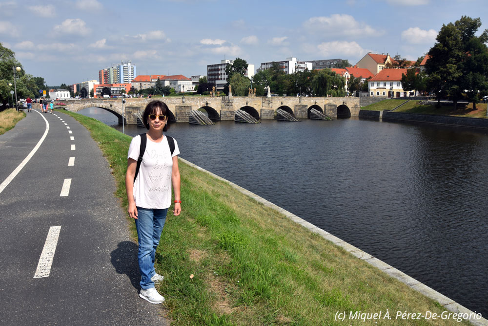 Anna con el puente de Písek al fondo
