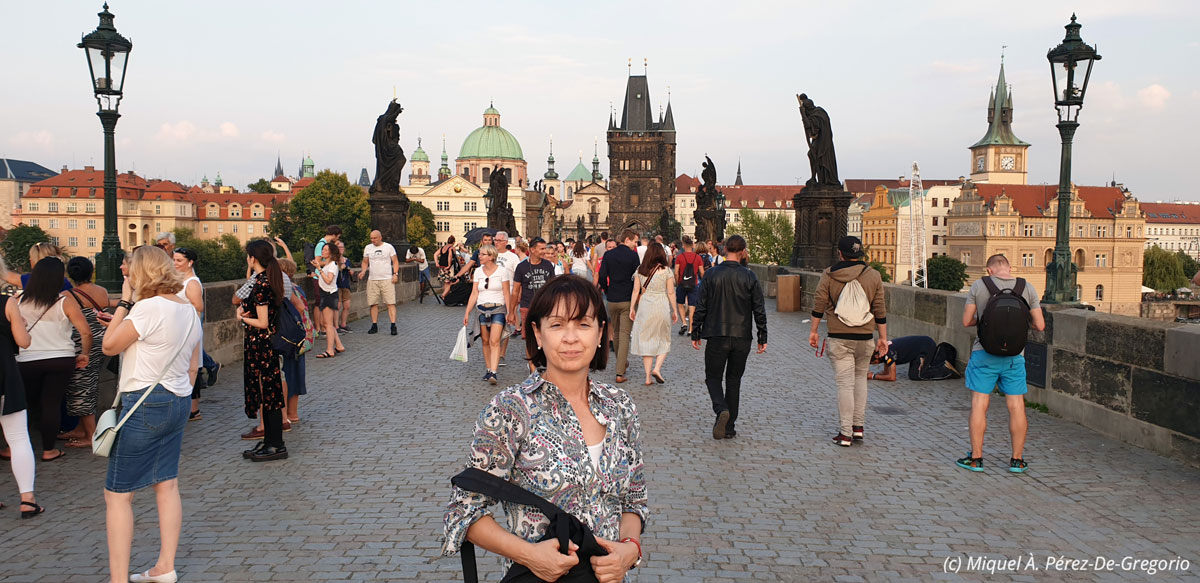 Anna en el famoso puente de Carlos, en la capital de Bohemia, Praga, al atardecer