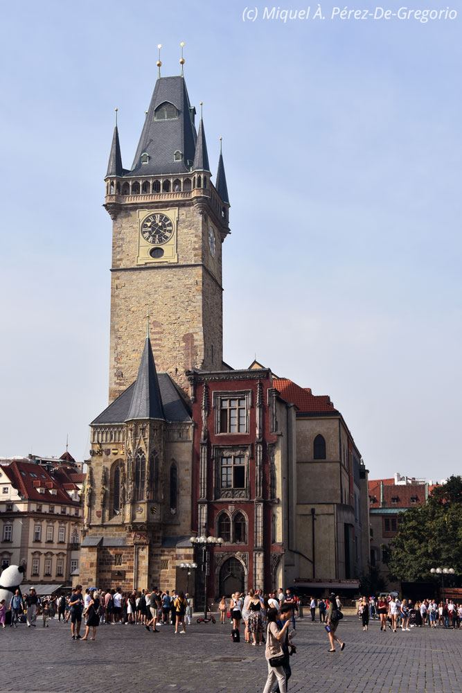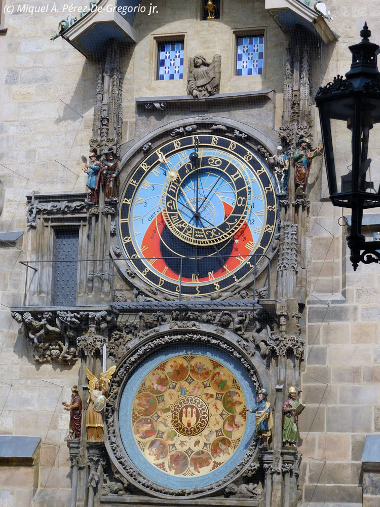 Tras la visita, al ser las 11 menos diez minutos, surgió la ocasión de contemplar "la hora" en el famoso reloj astronómico. Se trata de un reloj medieval (s. XV) situado en la fachada sur del Ayuntamiento de la Ciudad Vieja. Los tres principales componentes del reloj son: (1) el cuadrante astronómico, que además de indicar las 24 horas de día, representa las posiciones del sol y de la luna en el cielo, además de otros detalles astronómicos; (2) las figuras animadas que incluyen "El paseo de los Apóstoles", un mecanismo de relojería que muestra, cuando el reloj da las horas, las figuras de los doce Apóstoles; y (3) el calendario circular con medallones que representan los meses del año. Las cuatro figuras que flanquean el reloj son cuatro alegorías. De izquierda a derecha son: la Vanidad, representada por un hombre que sostiene un espejo; la Avaricia, representada por un comerciante judío con su bolsa; la Muerte, representada por un esqueleto con un reloj de arena; y la Lujuria, representada por un príncipe turco con su mandolina. Cada hora entre las 9 de la mañana y las 9 de la noche, las figuras se ponen en movimiento. El vanidoso se mira en el espejo, el avariento mueve su bolsa, el esqueleto blande su guadaña y tira de una cuerda, el lujurioso mueve la cabeza para mostrar que acecha siempre. Todas las figuras mueven sus cabezas negativamente, excepto la de la Muerte, simbolizando que ella tiene siempre la última palabra. Además, las dos ventanas se abren y empieza "El Paseo de los apóstoles". Los doce apóstoles desfilan lentamente asomándose a la ventana precedidos por San Pedro, gracias a un mecanismo circular en el interior sobre el que están ubicados seis a cada lado. Cuando las ventanas se cierran, un gallo (añadido en 1882) aletea y canta, después suenan las campanas en formato de 24 horas.