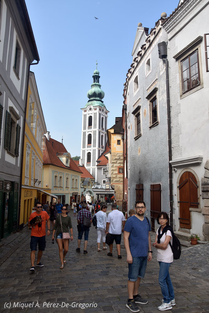 Sábado 24 de agosto, tras desayunar bien en el hotel Dvorák, nos informan de que el check out es, como máximo, a las 11 h., así que no podemos perder tiempo y nos encaminamos a visitar el Castillo de Cesky Krumlov y el barrio de Latrán. Cesky Krumlov es una pequeña ciudad de unos 13.000 habitantes, patrimonio de la Humanidad desde 1992. Y no es para menos. Sus callejuelas, sus plazas, sus casas, son de una belleza impresionante. Diríase que nos hallamos ante una maqueta o un estudio de cine construido ad hoc. De hecho, y a pesar de su delicadeza, sus calles fueron escenario de la película de terror "Hostel", de Eli Roth & Quentin Tarantino. Su núcleo antiguo se halla en un meandro del río Moldava, que lo rodea como una lengua, pero su buque insignia es su famoso castillo (s. XIII), que cuenta con uno de los mejor conservados teatros barrocos del mundo, así como museos y estancias, y unos jardines bellísimos. Es el segundo más grande después del de Praga. Hay que hacer una aclaración. Cuando se habla en la República Checa de "castillos", nos estamos refiriendo más a fortalezas o (como diríamos aquí), palacios fortificados. Nada que ver con los castillos ibéricos. En todo caso, cumplían su función y, para ello, suelen estar situados en lugares altos, de difícil acceso, para fastidio -hoy en día- de los turistas que los visitamos. Y encima hay que subir a sus torres ! con sus escaleras empinadas y estrechas, y todo ello con el calor del mes de agosto. ¿Vale la pena el esfuerzo? La verdad que sí. Las vistas son impresionantes, y la empinada subida hacia los jardines del castillo, vale la pena. Sus "jardines", en realidad, bosques, con hayas, robles, carpes y nogales, rezumaban humedad, y allí pudimos ver muchas aves y bastantes setas, a diferencia de la sequía que habíamos dejado en nuestra Girona..... En el foso del castillo, viven unos osos pardos, que aunque con espacio y bien cuidados, siempre da algo de pena verlos privados de libertad. Bajando del castillo, paseo rápido por al barrio de Latrán, al pie del mismo, con sus callejuelas, tiendas de artesanía, etc. Sin duda la visita a Cesky Krumlov fue de lo mejor del viaje.
