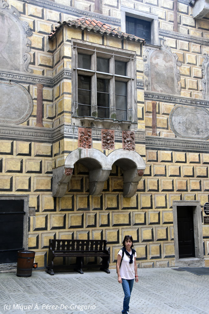 Anna en uno de los patios del castillo, bajo una ventana ricamente decorada