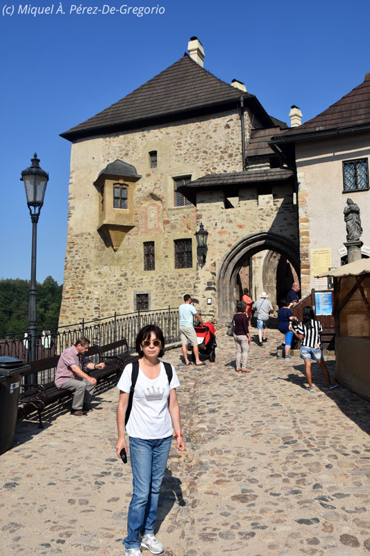 Domingo 25 de agosto. Este iba a ser un día fantástico y muy bien aprovechado. Tras desayunar de maravilla en el Marriott de Pilsen y pagar los apenas 2 € por el parking, nos dirigimos hacia el pueblecito de Loket, a unos 80 km al noroeste de Pilsen. El último tramo atraviesa el bosque de Slavkov, una zona verde, poco alterada por el hombre, con frondosos bosques de píceas, abedules y pinos rojos. Es domingo, y tras el quinto o sexto coche aparcado en el bosque, comprobamos que los checos también son aficionados a coger setas. En poco más de una hora, llegamos a un pequeño puerto sinuoso y, a nuestra derecha, aparece la silueta del pueblecito de Loket. De a penas 3.000 habitantes, este pueblo toma el nombre la palabra "codo", por la forma que le otorga al rodearlo el río Ohre, afluente del Elba. Todo el pueblo es monumento nacional, en el que destaca su castillo gótico del s. XII. Además de su belleza natural y su patrimonio histórico, este pueblo es conocido por haber servido de plató en algunas de las escenas de la película "Casino Royale" (2006), de la serie de James Bond. Aparcamos nuestro Skoda en la plaza, casi en el mismo sitio en donde 007 aparcó su Aston Martin, y nos encaminamos hacia el castillo, visitando sus salas y subiendo a la torre. Sin duda, uno de los pueblos con más encanto de Chequia.