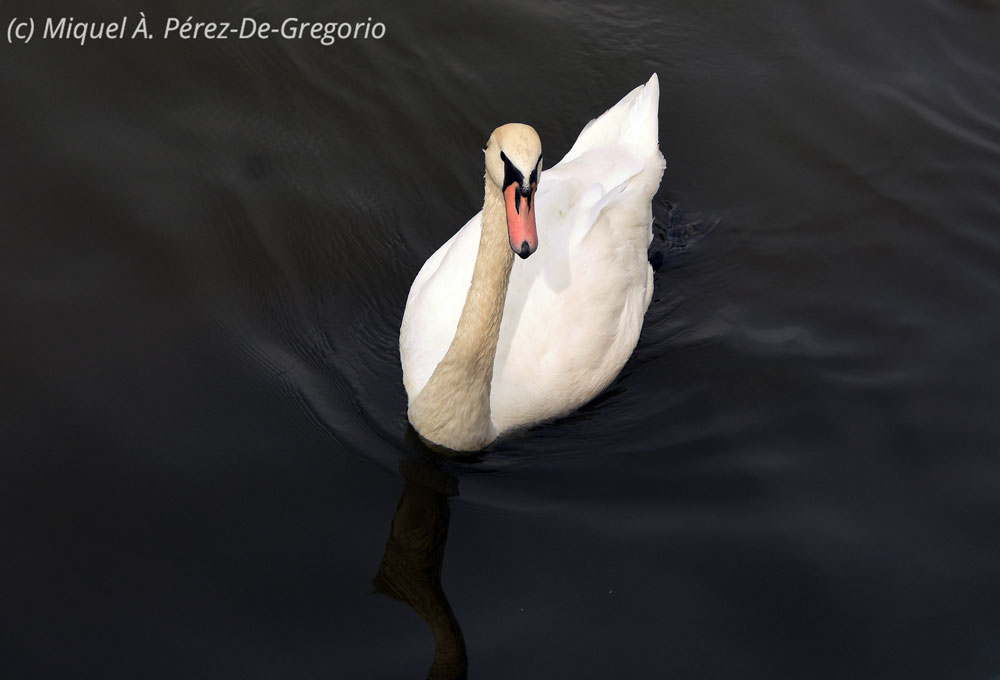 Un cisne (Cygnus olor) se acerca a nuestro barco. Es una de las aves más comunes en el río Moldava a su paso por Praga, aunque también se ven gaviotas comunes y cormoranes (tan lejos del mar !), pollas de agua, ánades reales o porrones moñudos