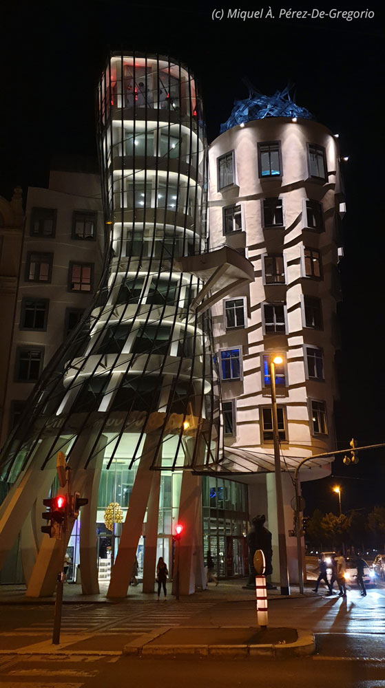 El paseo duró más o menos una hora y media, y como el embarcadero estaba bastante cerca del hotel, regresamos a descansar un rato, que el día había sido - de nuevo - muy intenso. Para nuestra última noche, preparé una sorpresa. Como se suele decir, matar dos pájaros de un tiro. Para descansar de la comida checa (más, siendo una cena) busqué información de los restaurantes vietnamitas mejor valorados, y escogí ir al restaurante Yori, en la Ciudad Nueva. Así que, pedimos un UBER y para allá que vamos. Se trata de un moderno restaurante vietnamita, aunque también tienen platos tailandeses y japoneses. Cenamos de maravilla, y como de costumbre en Chequia, a muy buen precio. Además, está muy cerca del singular edificio conocido como "Dancing House". La casa danzante (en checo, Tančící dům) es un edificio deconstructivista de Nationale-Nederlanden situado en una parcela frente al río Moldava. Fue diseñado en 1992 por el arquitecto checo-croata Vlado Milunić en colaboración con el canadiense Frank Gehry, y terminado en 1996. El diseño, no muy tradicional, fue polémico en su momento porque la casa destaca entre los edificios barrocos, góticos y de Art Nouveau del céntrico distrito Praga 2. El entonces presidente checo, Václav Havel, que vivió durante décadas junto al edificio, apoyó activamente este proyecto con la esperanza de que el edificio se convirtiese en un centro de actividad cultural. Originalmente fue llamado edificio Fred and Ginger, por los famosos bailarines Fred Astaire y Ginger Rogers, ya que la sensación que evoca la construcción es de una pareja de bailarines, pero este nombre rara vez se utiliza. Un par de fotos, y otra vez con UBER, vuelta al hotel.