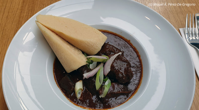 Comida en el Tiskárna: goulash de ternera con knedlíks (dumplings, en inglés). Aunque el goulash es de origen húngaro, es muy apreciado en Chequia. Es un plato fuerte, consistente, pero muy sabroso. Los knedlíks (podria traducirse por "empanadillas"), aunque algo sosos a nuestro paladar, son imprescindibles en la gastronomía checa, sobre todo para acompañar platos de carne con salsa. Se hacen con pan de día anterior, leche, huevos y mantequilla.