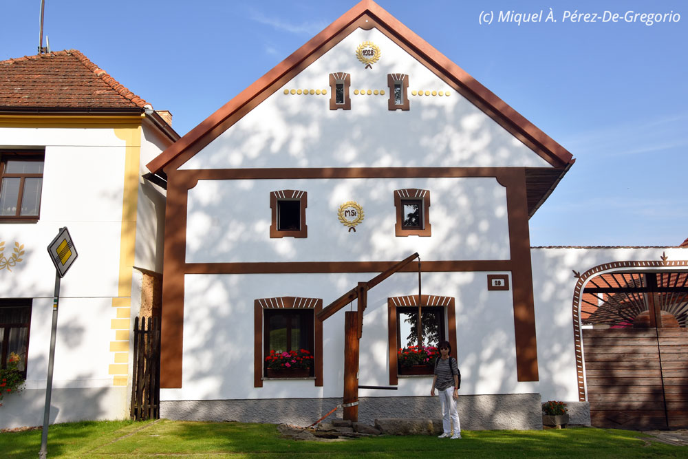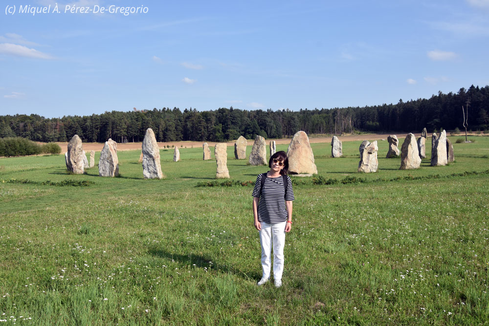 Tras la visita, tomamos la ruta hacia el pueblo de Telc, a poco más de 100 km hacia el sur de Kutná Hora. Siendo exactos, la población de Telc no está en Bohemia, sino ya en Moravia. Sin embargo, de todas las posibilidades de visita en ruta escogí esta, ya que me pareció un pueblo digno de visitarse. La ruta se nos hace tranquila y el paisaje, fantástico. Además, Miquel jr. me va guiando cogiendo a menudo carreteras menos transitadas y más bellas. Sobre las 11.30 h. llegamos a Telc, ciudad patrimonio de la Humanidad desde 1992. Aparcamos cerca del centro y en un corto paseo llegamos a su magnífica Plaza Mayor, repleta de coloridos edificios renancentistas, hoy en día, muchos de ellos, tiendas de recuerdos, artesanía, hoteles, bares o restaurantes. Hay turistas, pero se respira tranquilidad. Destacan algunas casas con exterior esgrafiado, de gran belleza. Paseamos un rato, hacemos unas cuantas fotos y nos quedamos a comer. Tras algunas dudas, decidimos dar un respiro a la cocina checa y comemos algo ligero en el restaurante Amigo, con comida mexicano-norteamericana. Correcto. Tras la comida, seguimos ruta. Decidimos no parar en la ciudad de Ceské Budejovice, de algo más de 100.000 habitantes, con mucho tráfico alrededor. Conocida también por su nombre alemán Budweis, es la sede de la famosa cerveza checa Budweiser Budvar, además de una importante ciudad universitaria. En lugar de ello, decidimos ir hasta el pueblo de Holasovice, a poco más de 100 km de Telc, una vez pasado Ceské Budejovice. Ya dije que este viernes era un día muy apretado, y por ello era imposible verlo todo....Holašovice es un pueblecito perdido, como surgido de la nada, y con una peculiar historia. Aunque sus orígenes se remontan al s. XIII, entre los s. XVI y XIX se convirtió en un enclave de lengua alemana, aunque no llegó nunca a superar los 200 habitantes. Tras la Segunda Guerra Mundial, la mayoría de habitantes de origen alemán se fueron, quedando prácticamente abandonado hasta la década de los 90 del s. XX. Fue declarado patrimonio de la Humanidad en 1998 y cuenta con unos 150 habitantes. Muy cerca está la zona protegida del bosque de Blansky, con abundante fauna. En los alrededores del pueblo, hay una curiosidad muy visitada, conocida como el Stonehenge de Holašovice. Se trata de una reproducción del cromlech inglés, realizada por un artista local. El lugar es curioso, y el paseo es muy agradable. Tras tomar algo en una de las famosas casas del pueblo, de estilo llamado "barroco rural", cogemos de nuevo el coche y vamos hasta nuestro próximo destino: Cesky Krumlov, a unos 25 km de Holašovice.