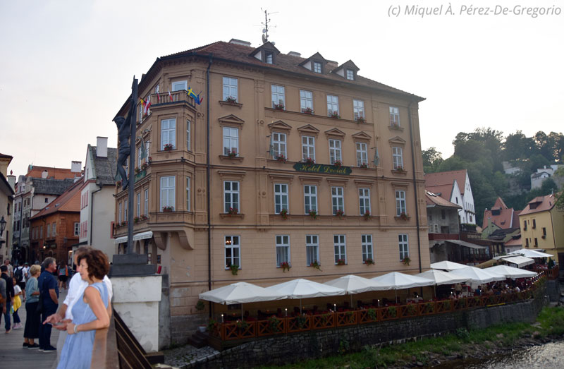 A eso de las 18 h. llegamos a Cesky Krumlov. En seguida sabremos tres cosas: dicen que es el pueblo más bonito de la República Checa (de acuerdo); aquí sí que hay turistas; y todo el centro o casco histórico es peatonal. Intentamos dejar el coche lo más cerca posible de nuestro hotel, pero aún así, aparcamos lejos, con lo que hubo que "arrastrar" las maletas por medio pueblo medieval... Y digo arrastrar, porque las calles son adoquinadas y no están pensadas para las ruedecitas de las maletas al uso... Una vez superado ese trance, llegamos a nuestro hotel, con una ubicación inmejorable, en la orilla del río Moldava, justo antes del puente de Lazebnický. Nuestro hotel se llama Dvořák, en honor al compositor romántico. Nos instalamos, descansamos un poco, paseamos por los alrededores y nos disponemos a cenar. En nuestro paseo, topamos con un resturante vietnamita que tiene muy buena pinta, el My Saigon, y no lo dudamos ni un momento. Será una de las mejores cenas de nuestro viaje. Tras la cena, regreso al hotel y a descansar, que al día siguiente teníamos otra intensa jornada.