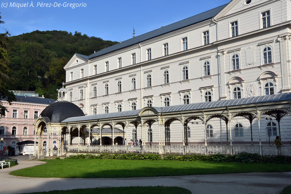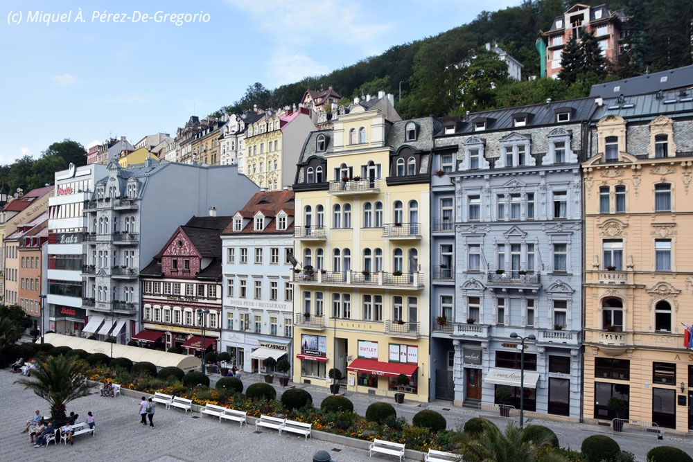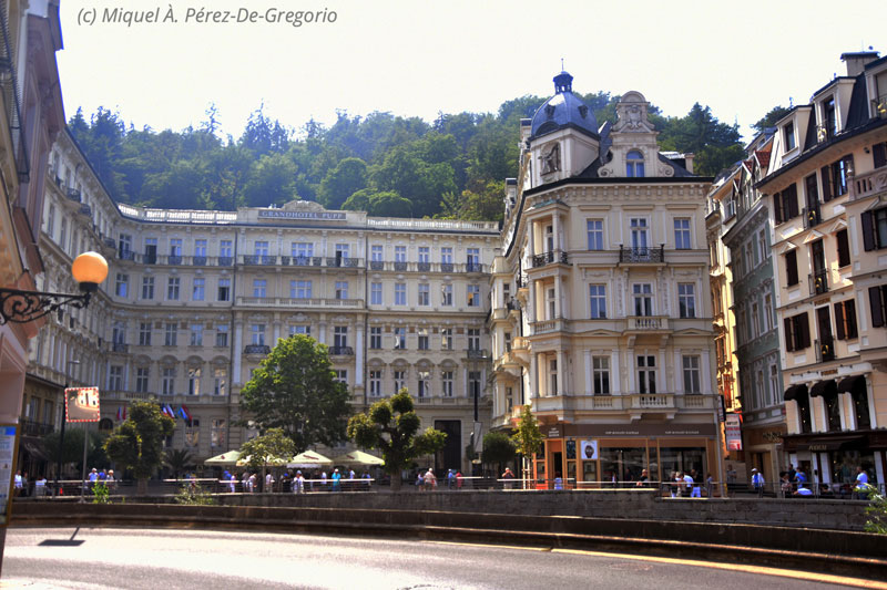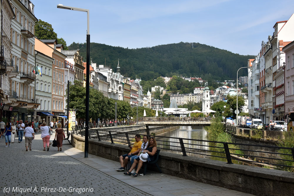 Vista general del pueblo desde las afueras Tras la visita y tomar una bebida, seguimos camino hacia nuestro próximo destino: Karlovy Vary. Esta ciudad balneario, se halla a unos 14 km de Loket, en la confluencia de los ríos Ohre y Tepla. Fue fundada en el s. XIV por el emperador Carlos IV, al que se debe su nombre. Históricamente famosa por sus fuentes termales (13 fuentes principales y unos cientos más pequeñas) y el río Teplá, también de aguas calientes, tuvo su mayor esplendor en el s. XIX, cuando varios personajes ilustres la visitaban por las propiedades curativas de sus aguas. La arquitectura de la parte histórica es impresionante y muy rica, denotando un pasado resplandeciente. Otra de las referencias de la ciudad es que es la sede donde se creó la Becherovka, una bebida alcohólica amarga, a base de hierbas, y muy popular, de 38º. Como pasaba con Loket, la ciudad de Karlovy Vary también sirvió de plató para la película de 007 "Casino Royale", especialmente su famoso y elegante hotel Pupp. En la actualidad cuenta con unos 55.000 habitantes.A Karlovy Vary acudieron personajes como Goethe, Dvorak, Karl Marx, Freud, Tolstoi, Beethoven, Bach, etc., y más recientemente, famosos como los hermanos Coen, Oliver Stone, John Travolta, Isabelle Huppert, Morgan Freeman o John Malkovich, muchos de los cuales se alojaron en el hotel Pupp, en donde tienen su placa en el suelo de la plazoleta de la entrada principal.En Karlovy Vary nos alojamos en el hotel Kavalerie, en la calle Masaryka, de nuevo peatonal, con lo que tuvimos que buscar un parking cercano, y en el hotel nos dieron un vale descuento. Es un hotel de 3 estrellas, sencillo, en el que lo mejor es el desayuno, pero que tiene dos inconvenientes. Uno, principalmente en verano, no cuenta con aire acondicionado. El segundo, y más si te pasa como a nosotros, no tiene ascensor, y nos tocaron habitaciones en el 5º piso ! Aunque en el fondo el sitio es correcto, no lo recomiendo por lo dicho, además de que está a 2 km a pie del hotel Pupp, para situarnos...Una vez instalados, con esto de los horarios checos, nos damos cuenta que es tarde y salimos a comer. Pasamos de los restaurantes cercanos, más de tipo comida rápida o internacionales, y aunque estamos bastante cansados, hacemos algo más de 2 km para llegar al restaurante del hotel Embassy. Algo exhautos, por la caminata y por la hora, entramos en el local, bellamente decorado, y muy tranquilo, para hacer una de las mejores comidas checas del viaje. Es algo más caro que otros locales, pero la comida y el local, lo valen. Tras la comida, regresamos por nuestros pasos a lo largo de los márgenes del río Tepla. Coincidimos con una prueba de triatlón, y varias zonas están acordonadas y prohibido el paso. A pesar de ello, no tenemos más días, así que, como podemos, vamos visitando los sitios más característicos de esta ciudad balneario: el hotel Pupp, el Pabellón de las Fuentes Termales, las columnatas del Molino y del Mercado, y finalmente nos sentamos un rato en el tranquilo Parque de Dvorák. Anna y Miquel se atreven a probar las aguas termales, entre 20 y 65 º C. Al final, reventados de todo el día para arriba y para abajo, regresamos al hotel. Anna y yo nos quedamos un poco en el bar de abajo del hotel, degustando una maravillosa cerveza negra de barril. Llegada la hora de cenar, sobre las 9, decido que estoy demasiado cansado para volver a bajar y subir los 5 pisos, y prefiero ver el Barça-Betis en mi móvil, mientras Miquel y Anna salen a comprar unas hamburguesas y wrapps al McDonalds cercano. Hoy tocará cena rápida en nuestra habitación....