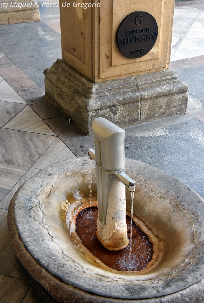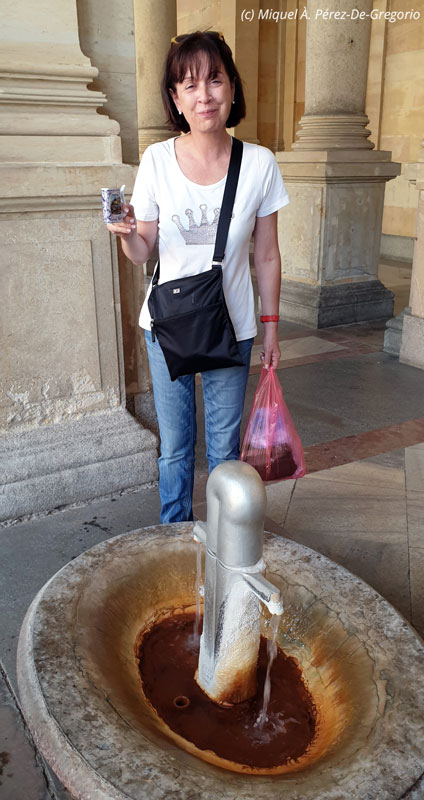 Una de las fuentes del Pabellón de las Fuentes Termales, con agua a 56 º C Anna probando el agua de otra de las fuentes, con la típica jarra de procelana de Karlovy Vary