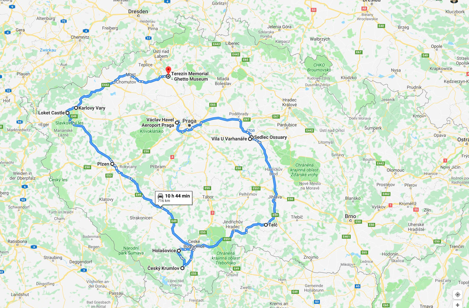 Mapa de la ruta realizada, con regreso y final en Praga. Unos 800 km en total