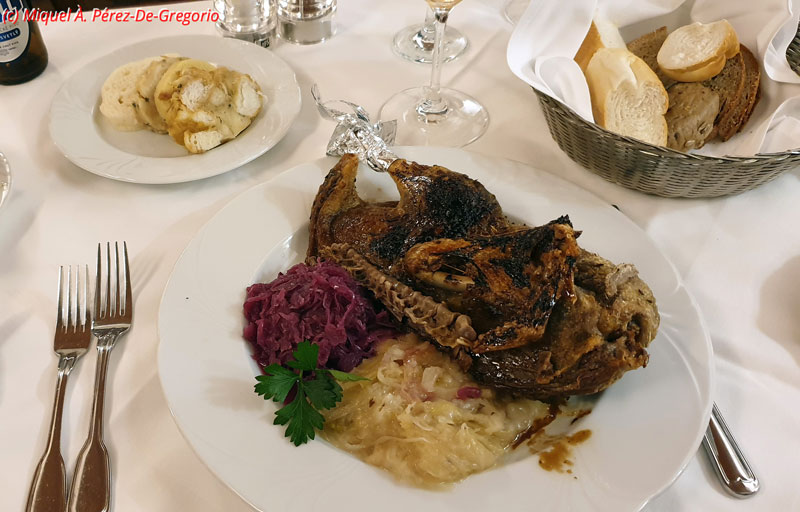Medio pato asado crujiente, con col lombarda y sauerkraut, plato tradicional checo