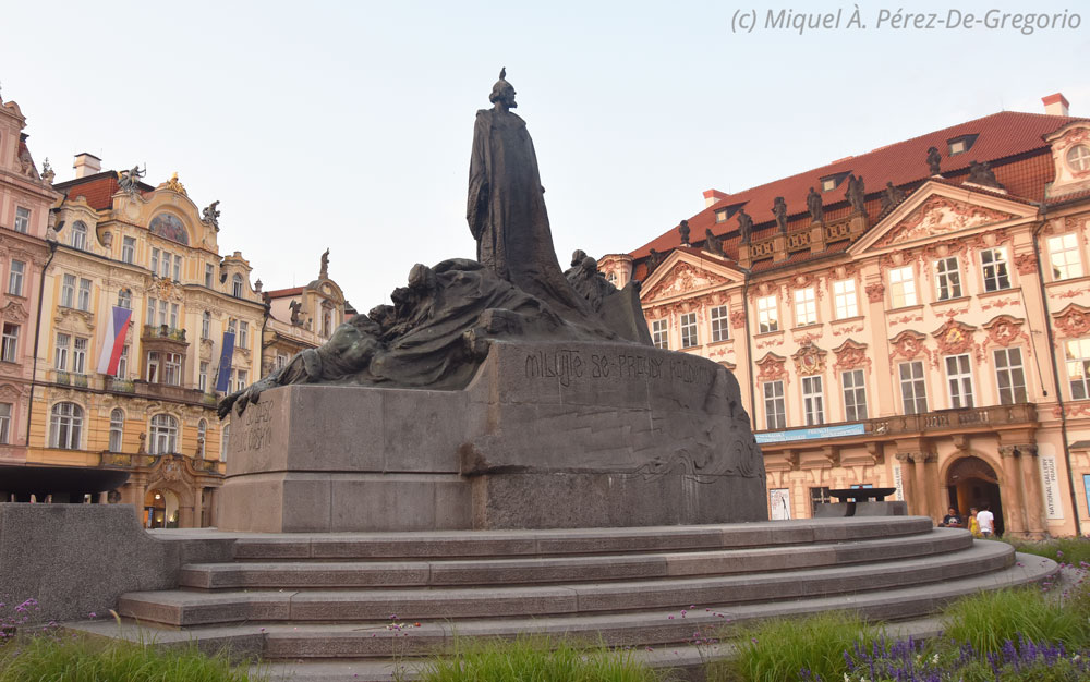 Monumento al maestro Jan Hus, en la Plaza Vieja de Praga. Jan Hus fue un teólogo y filósofo checo, rector de la Universidad Carolina de Praga. Como reformador y predicador se le considera uno de los precursores de la Reforma Protestante. Sus seguidores son conocidos como husitas. Murió quemado en la hoguera tras ser condenado de herejía en el concilio de Constanza.