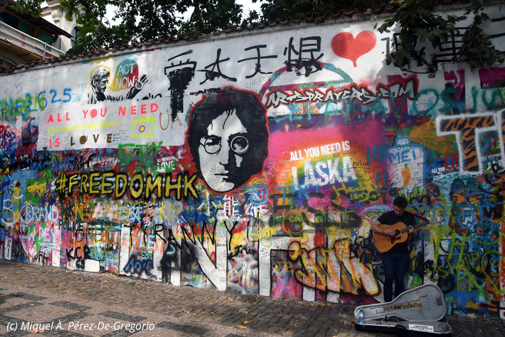 El famoso muro de John Lennon con músico callejero incluido, tocando, cómo no, una canción del mito