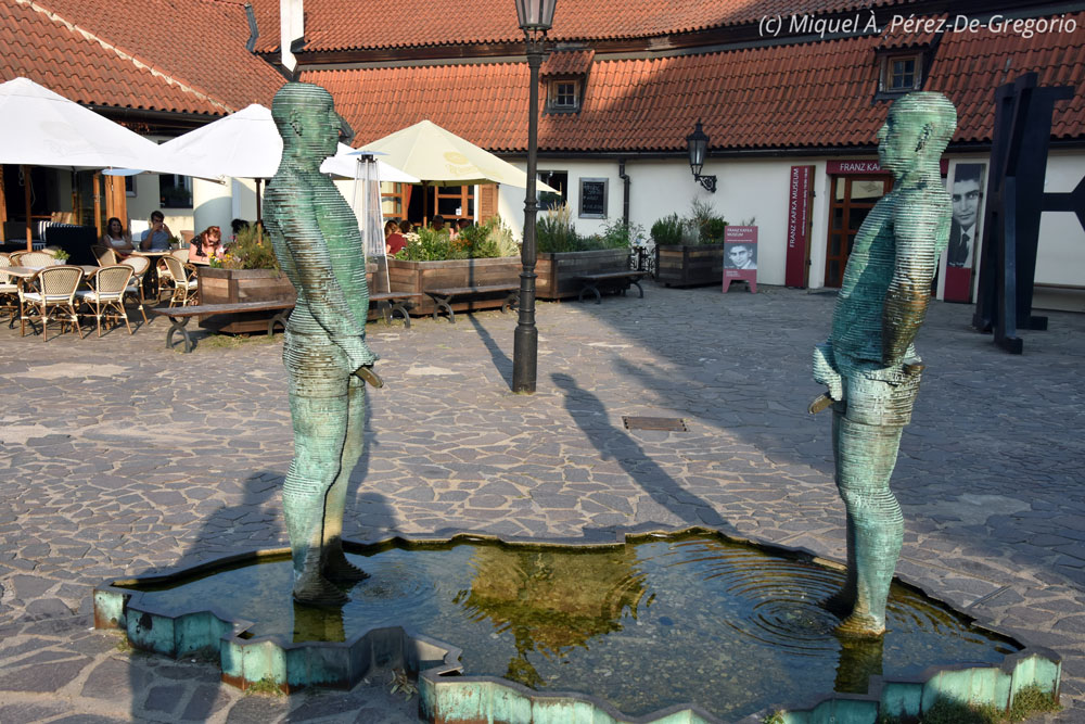 Había llegado el momento de abandonar el complejo del castillo de Praga. Ya eran las 17 h., que para nosotros es pronto, pero allí ya cierran casi todo y algunos hasta cenan. Estábamos reventados, pero aún así, decidimos ir andando, al menos, hasta el barrio de Malá Strana (ciudad pequeña), a los pies del castillo y en la ribera izquierda del río Moldava. Nada más salir del complejo del castillo, hay unos miradores fantásticos, con una vista panorámica de la ciudad de Praga, impresionante. Otra cosa que sorprende al viajero, son los viñedos de San Venceslao, junto a la villa Richter, que en esta época, con la parra verde, le dan una especie de aspecto tropical, muy curioso. Vamos bajando el pronunciado camino, y en pocos minutos llegamos a un parque y seguimos por la avenida del seminario Luzického, hasta encontrarnos con el Museo Kafka, dedicado a la vida y la obra del influyente escritor Franz Kafka. Por supuesto, con los horarios checos, aunque no son ni las 18 h., ya está cerrado, pero la plazoleta en donde se halla tiene un cierto encanto, y decidimos tomar unas bebidas en la terraza, junto a la famosa fuente obra del artista praguense David Černý, que representa a dos hombres orinando sobre el mapa de Chequia, y escribiendo frases en el agua, por medio de un sistema mecánico que mueve las figuras. Sin duda, no deja indiferente a nadie.