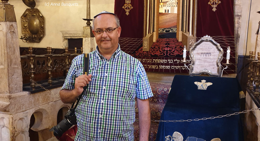 Con la kipá, en el inteior de la sinagoga Klausová