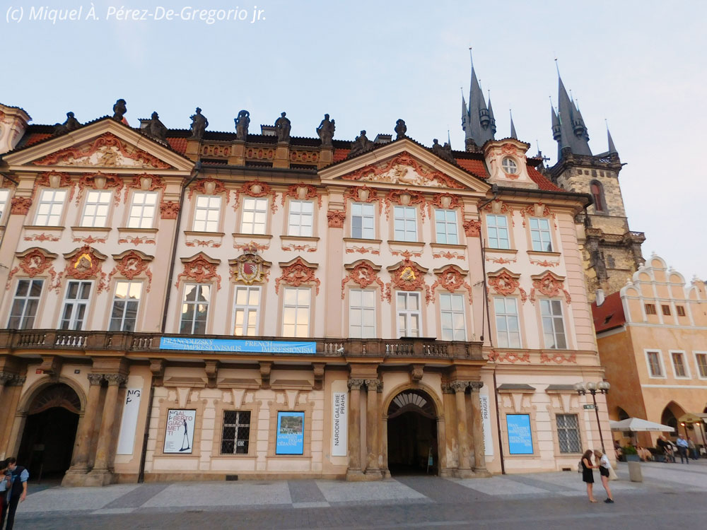 Miércoles 28 de agosto. Nuestro segundo día entero en Praga también iba a ser intenso. Empezaremos desayunando de maravilla en el bufet del Hotel Clement, y de ahí, dando un paseo, hacia la Plaza Vieja. No es lo mismo verla a la puesta de Sol, como el día anterior, que con la luz radiante de la mañana. Nuestra primera parada será en el Palacio Kinských, del s. XVIII, en plena Plaza Vieja y una de las sedes de la Galería Nacional Checa. En esta ocasión, pudimos ver en este palacio de estilo rococó, una exposición temporal sobre los pintores impresionistas franceses, como Monet, Pissarro, Renoir, Gauguin, Degas, etc. La entrada costaba 280 coronas, poco más de 10 €. Muy interesante.