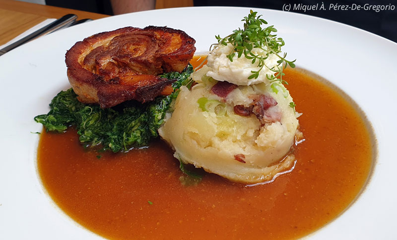 Miquel jr., pidió otro plato impresionante: panceta guisada en cerveza negra, con espinacas y pure de patatas con queso y bacon