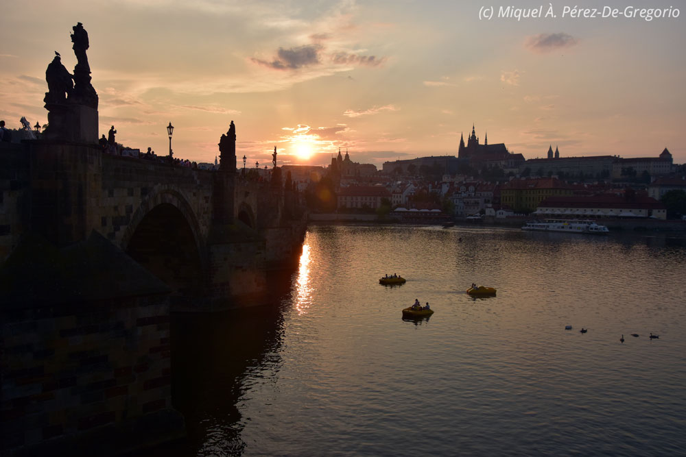 Puesta de Sol en el puente de Carlos, desde el lado derecho del río Moldava