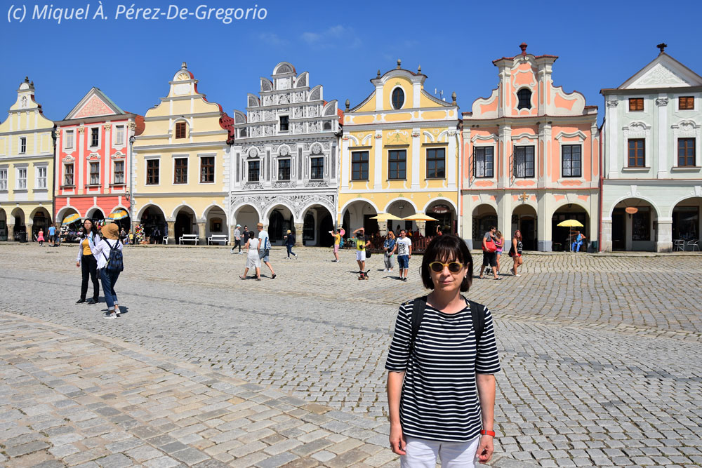 Anna frente a las casas típicas de la Plaza Mayor de Telc