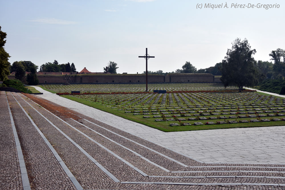 Lunes 26 de agosto. Si bien todos los días de la ruta fueron intensos, este lunes, último de la ruta en coche, sería sin duda especial. Antes de las 17.30 h., teníamos que devolver nuestro Skoda scala en el centro de Praga, lo que nos daba aún mucho juego para aprovechar el día. Cuando preparaba el viaje, barajando otras alternativas, en seguida me decidí por una: visitar el Campo de Concentración de Terezin. La ciudad de Terezin, a 120 km de Karlovy Vary y a unos 60 km al norte de Praga, fue fundada en el s. XVIII por los Habsburgo con el nombre de Theresienstadt, en honor a la emperatriz María Teresa.El recinto está compuesto por la ciudad amurallada de Terezin, y una pequeña fortaleza a escasos metros de la ciudad, de construcción similar, que sirvió de cuartel militar y cárcel, tanto por los checos como durante la Segunda Guerra Mundial por parte de la Gestapo. Ambos estaban conectados por túneles subterráneos. En el año de 1914 y tras ser condenado a 20 años de prisión, fue recluido en esta fortaleza Gavrilo Princip, responsable de los ataques del Atentado de Sarajevo, donde perdió la vida el archiduque Francisco y su esposa la condesa Sofía, hecho al que se le atribuye ser el detonante de la Primera Guerra Mundial. Princip murió en el año de 1918 cumpliendo su condena. Durante la Segunda Guerra Mundial la ciudad amurallada fue usada como ghetto judío y posteriormente sirvió como campo de concentración. La ciudad nunca tuvo la función de campo de exterminio, pero sirvió de prisión temporal para muchos que sí fueron enviados a otros campos para ser ejecutados. Dada la habitabilidad de la ciudad antes de la contienda, y que los primeros exiliados fueron artistas e intelectuales, el gobierno nazi la usó como propaganda sobre el buen trato y alto nivel de vida que se proporcionaba a los judíos en los ghettos, llegando a engañar a un equipo de inspectores internacionales e incluso filmando documentales preparados, cuando en realidad las condiciones de vida de las personas obligadas a vivir allí era deplorable. Al sur de la ciudad se encuentra un edificio con cuatro hornos crematorios, que hacia el final de la contienda no daban abasto para deshacerse de los fallecidos. Más de 150.000 judíos fueron trasladados al ghetto, de los que murieron aproximadamente 33.000 en Terezín y otros 88.000 fueron deportados a campos de exterminio. Al final de la guerra había 17.247 supervivientes. Tras la guerra la fortaleza se destinó a usos militares hasta que fue abandonada en 1996. Hoy en día está abierta para el público como muestra del holocausto. Anexo a la fortaleza hay un gran cementerio. Actualmente existen varios museos en la ciudad y la fortaleza donde se explica la historia del campo y las personas que allí vivían, incluyendo artículos de la época y reconstrucciones.Como nos pasó en nuestro viaje a Camboya y la visita a la cárcel de la capital camboyana, la visita a este tipo de recientos siempre es dura. Sin embargo, la única manera de intentar que no se repitan episodios tan graves, es no olvidarlos. La visita nos gustó mucho, y los diferentes edificios y museos están realizados con gran respeto. Nos gustó comprobar especialmente la presencia de escolares (adolescentes) alemanes (la frontera está muy cerca), sobre todo en los tiempos que corren en que, degraciadamente, algunas corrientes políticas se parecen demasiado a las de tiempos pasados, que provocaron el horror que se sufrió en este y en otros muchos campos.Tras visitar la llamada "pequeña fortaleza" y su museo, hicimos una pausa para comer en un restaurante sencillo del centro del pueblo, el Klobouk, que tiene además la peculiariedad de que forma parte de un proyecto de integración de personas con discapacidades psíquicas. Además de contribuir a una buena causa, comimos un menú del día muy bueno y muy barato. Tras la comida, visitamos el Museo del Ghetto, imprescindible para entender lo que fue Terezin y el holocausto judío.Aspecto general del cementerio de Terezin