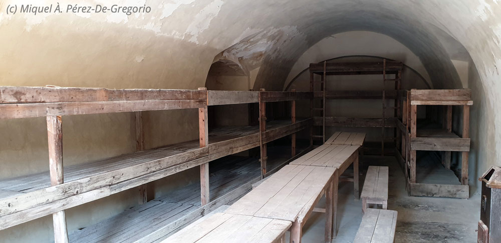 Aspecto de una de las habitaciones: camastros, mesas y una estufa. En la imagen no se ve, pero había una sola letrina. En este espacio metiron a decenas de personas, hacinadas las unas contra las otras. A mi me recordó mucho las imágenes de la película "La vida es bella"