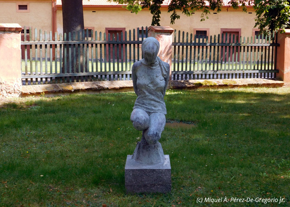 Impactante escultura de una mujer arrodillada, con las manos atadas a la espalda y la cabeza cubierta con un capuchón Esta "prisionera" puede verse en el jardín de la entrada de la exposición permanente de la llamada Small Fortress