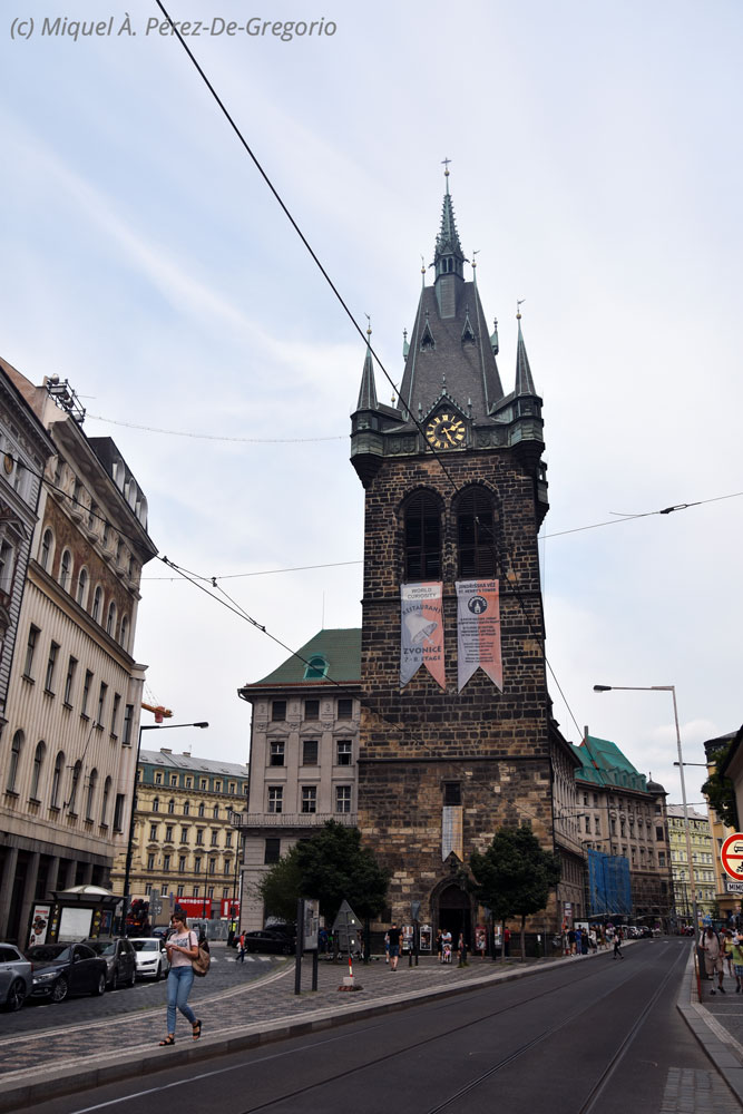 Ya recuperados, regresamos por el puente de Carlos, y la calle Karlova, hasta la Plaza Vieja, pero esta vez, seguimos por la calle Celetná, hasta la famosa Torre de la Pólvora, preciosa tore gótica del s. XV, que daba la entrada a la Ciudad Vieja. Giramos por la calle Na Příkopě, ya en la parte nueva de la Ciudad Vieja, y por la calle Panská (donde está el museo Mucha), llegamos a la calle Jindřišská, en donde está el restaurante que escogí para comer: el Tiskarna. Me lo habían recomendado mucho, y la verdad es que estuvieron acertados. El local es joven y moderno, y el servicio, muy amable y atento. El plato más caro de la carta, son 18 €. Nosotros pedimos un entrante a compartir, tres platos principales, y tres bebidas (cerveza negra de barril), y nos salió por 15 € por persona. Genial ! Nada más entrar, Anna pidió una cola zero, y le dijeron, amablemente, que allí solo se servían productos checos. Empezaba la cosa bien ! Sin duda, el mejor restaurante de todo el viaje. Todo muy rico y hecho a la vista (teníamos la cocina muy cerca, y está a la vista de los comensales).La imponente Torre de la Pólvora, una de las 13 puertas originales de la Ciudad Vieja Debe su nombre a su uso como almacén de pólvora durante el s. XVII