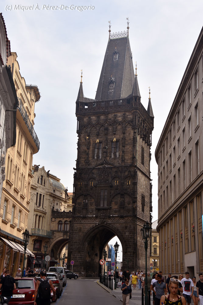 Ya recuperados, regresamos por el puente de Carlos, y la calle Karlova, hasta la Plaza Vieja, pero esta vez, seguimos por la calle Celetná, hasta la famosa Torre de la Pólvora, preciosa tore gótica del s. XV, que daba la entrada a la Ciudad Vieja. Giramos por la calle Na Příkopě, ya en la parte nueva de la Ciudad Vieja, y por la calle Panská (donde está el museo Mucha), llegamos a la calle Jindřišská, en donde está el restaurante que escogí para comer: el Tiskarna. Me lo habían recomendado mucho, y la verdad es que estuvieron acertados. El local es joven y moderno, y el servicio, muy amable y atento. El plato más caro de la carta, son 18 €. Nosotros pedimos un entrante a compartir, tres platos principales, y tres bebidas (cerveza negra de barril), y nos salió por 15 € por persona. Genial ! Nada más entrar, Anna pidió una cola zero, y le dijeron, amablemente, que allí solo se servían productos checos. Empezaba la cosa bien ! Sin duda, el mejor restaurante de todo el viaje. Todo muy rico y hecho a la vista (teníamos la cocina muy cerca, y está a la vista de los comensales).
